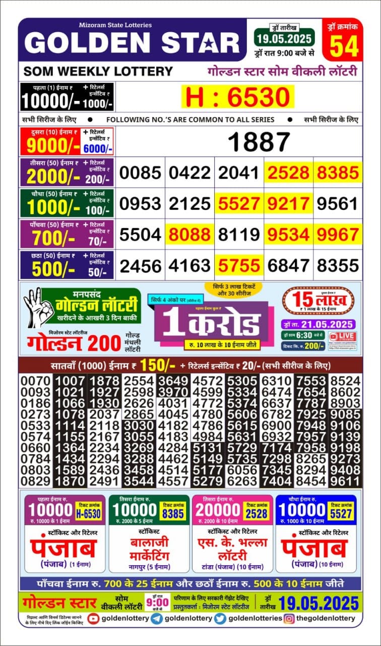 Golden Star weekly Lottery result 9pm 19.5.2025