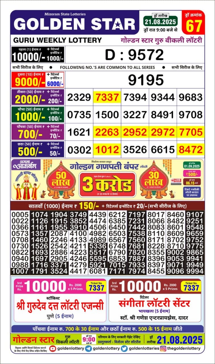 Golden Star Weekly Lottery Result 9pm 21.08.2025