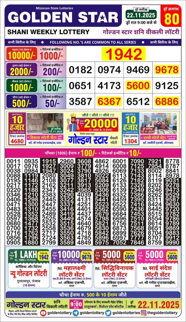 Golden Star Weekly Lottery Result 9pm 22.11.2025