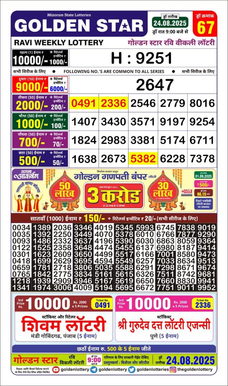 Golden Star Weekly Lottery Result 9pm 24.08.2025