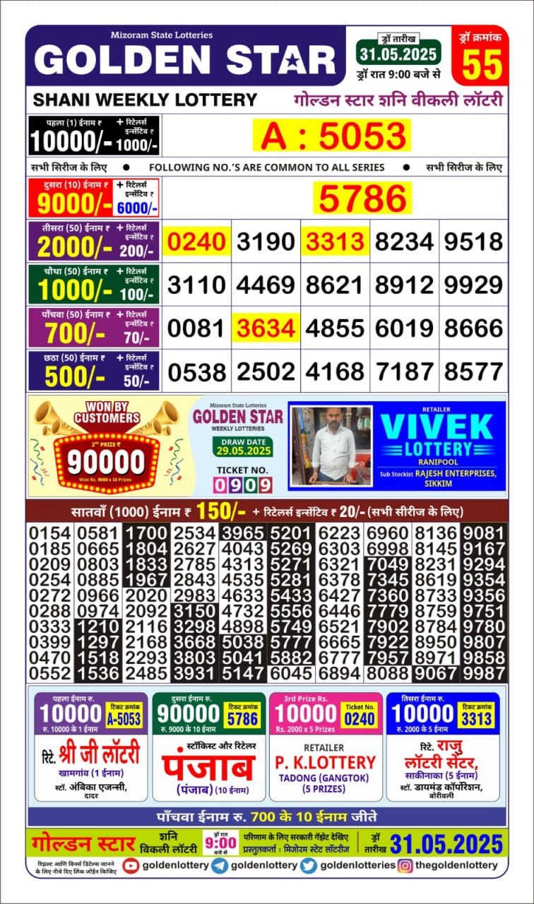 Golden Star weekly Lottery result 9pm 31.05.2025