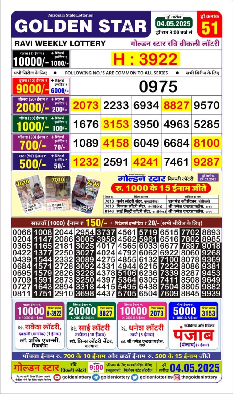 Golden Star weekly Lottery result 9pm 4.5.2025