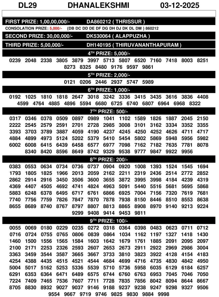Kerala Lottery Dhanalekshmi DL 29 Result 3PM Today 03.12.2025