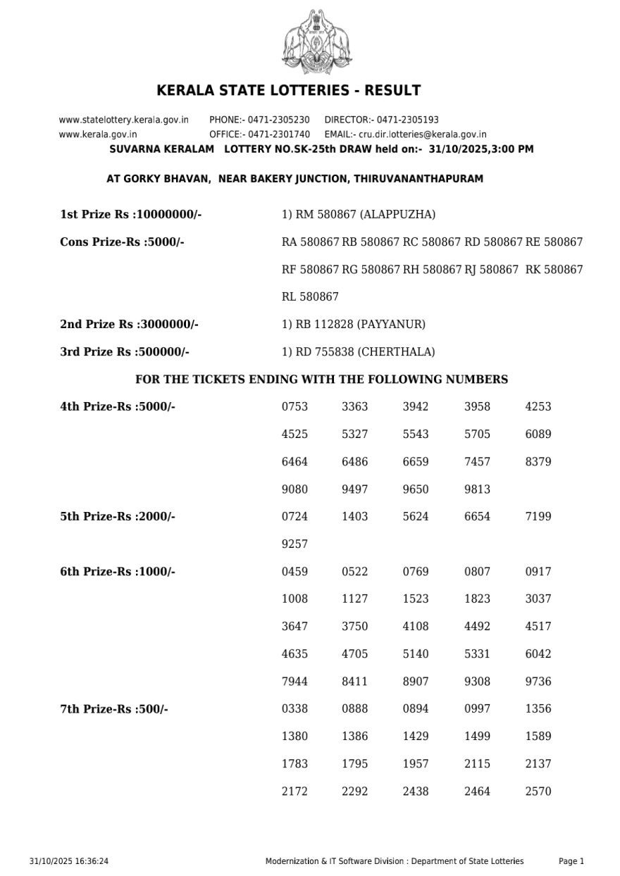 Kerala Lottery Suvarna keralam SK 25 Result Today 31.10.2025