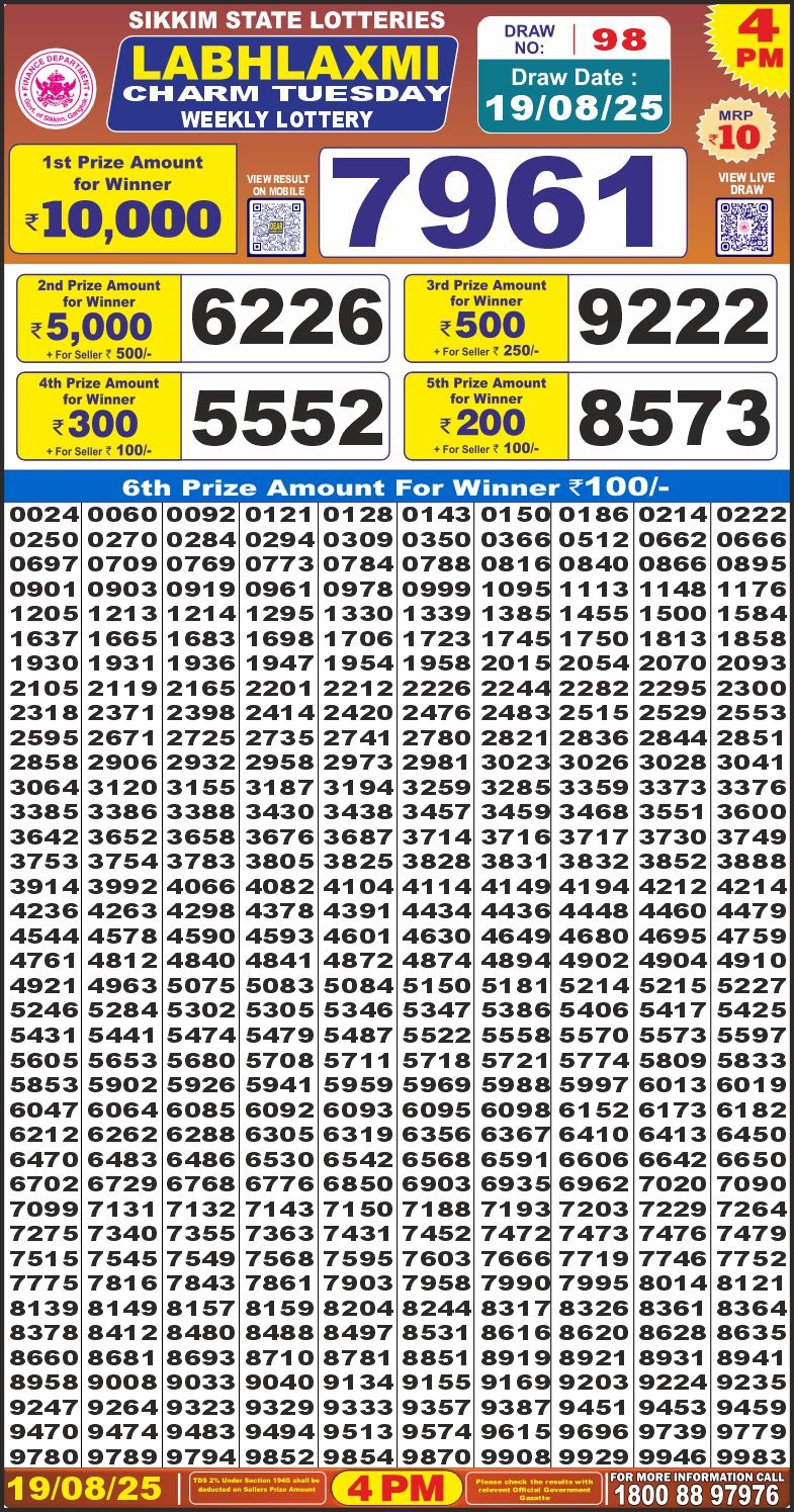 Nagaland State Lotteries was established in the year 1972 under the supervision of the Finance Department to generate a dependable source of revenue for the State Government. Nagaland State Lottery is held every day of the week at three different times of the day, Morning, Day, and Evening. Every day, the lottery is held under a different name with some difference in the prize money with the top prize worth ₹1 Crore (including Super Prize amount). The daily lotteries hosted by Nagaland State include Dear Morning Lottery, Dear Day Lottery, and Dear Evening Lottery which costs 6 Rupees for each ticket.