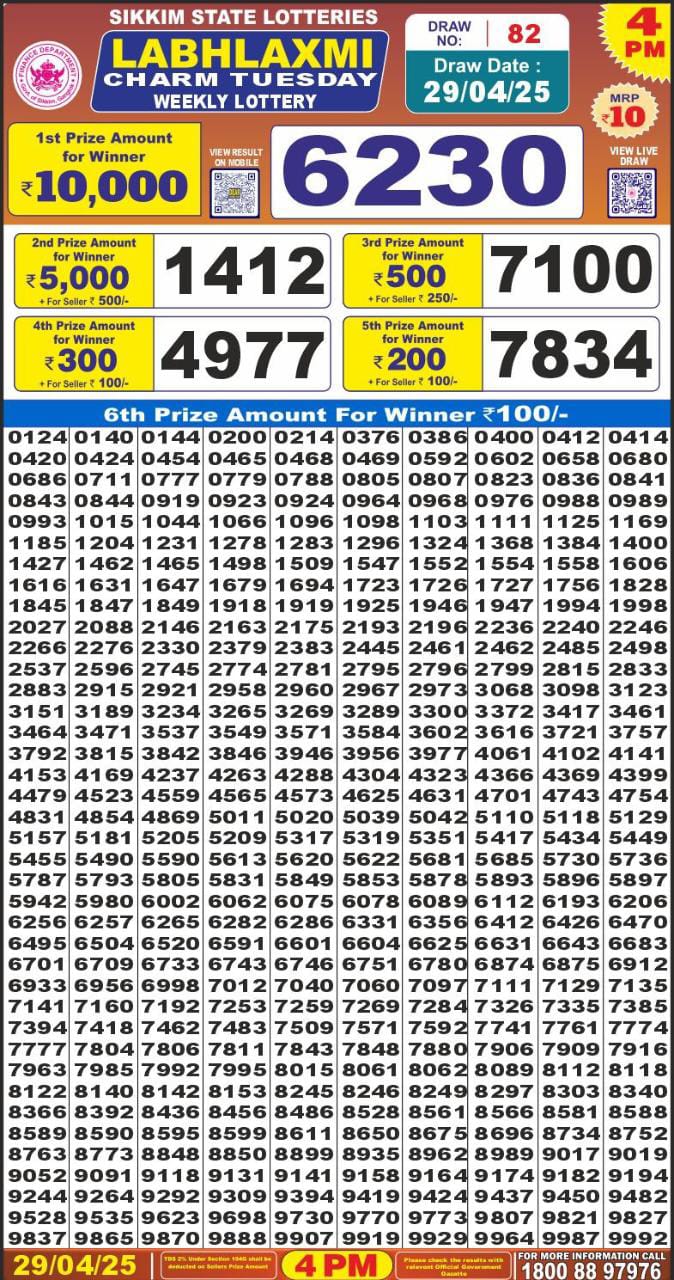 Nagaland State Lotteries was established in the year 1972 under the supervision of the Finance Department to generate a dependable source of revenue for the State Government. Nagaland State Lottery is held every day of the week at three different times of the day, Morning, Day, and Evening. Every day, the lottery is held under a different name with some difference in the prize money with the top prize worth ₹1 Crore (including Super Prize amount). The daily lotteries hosted by Nagaland State include Dear Morning Lottery, Dear Day Lottery, and Dear Evening Lottery which costs 6 Rupees for each ticket.