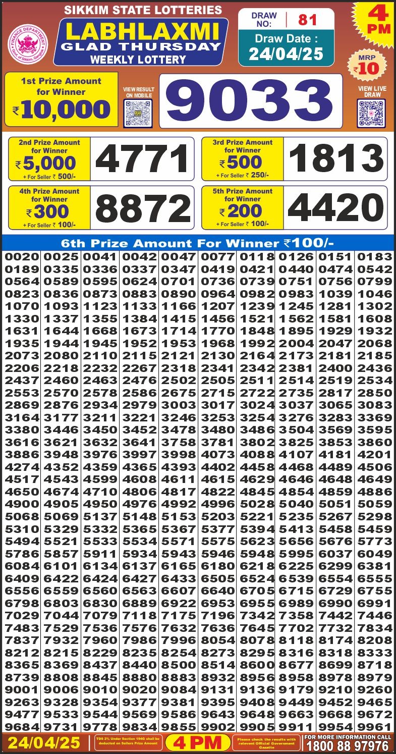 Labh Laxmi Glad weekly 4PM Result 24.4.25