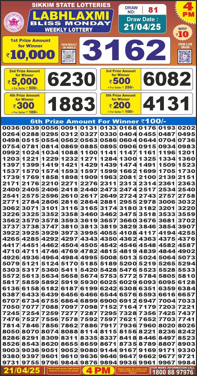 LabhLaxmi bliss weekly 4PM Result 21.4.25