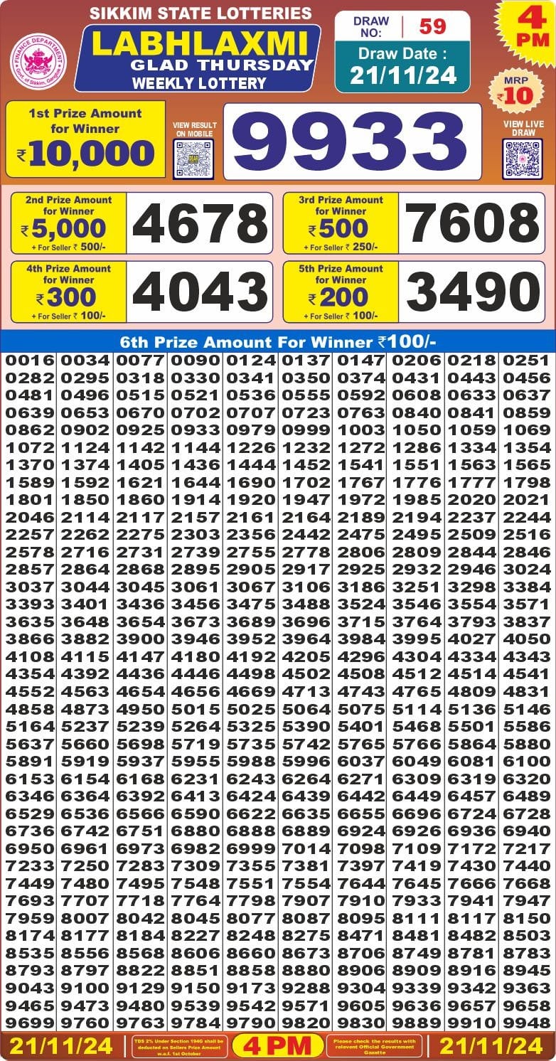 Nagaland State Lotteries was established in the year 1972 under the supervision of the Finance Department to generate a dependable source of revenue for the State Government. Nagaland State Lottery is held every day of the week at three different times of the day, Morning, Day, and Evening. Every day, the lottery is held under a different name with some difference in the prize money with the top prize worth ₹1 Crore (including Super Prize amount). The daily lotteries hosted by Nagaland State include Dear Morning Lottery, Dear Day Lottery, and Dear Evening Lottery which costs 6 Rupees for each ticket.