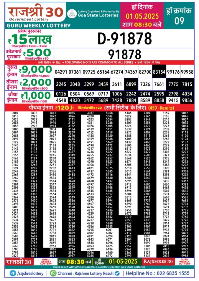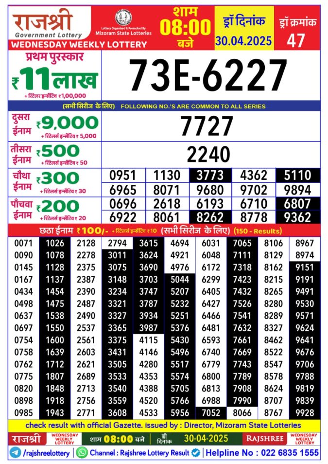 Rajshree Weekly Lottery 8PM Result 30.4.25