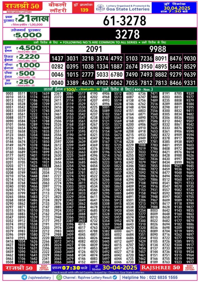 Rajshree 50 Lottery 7:30PM Result 30.4.25