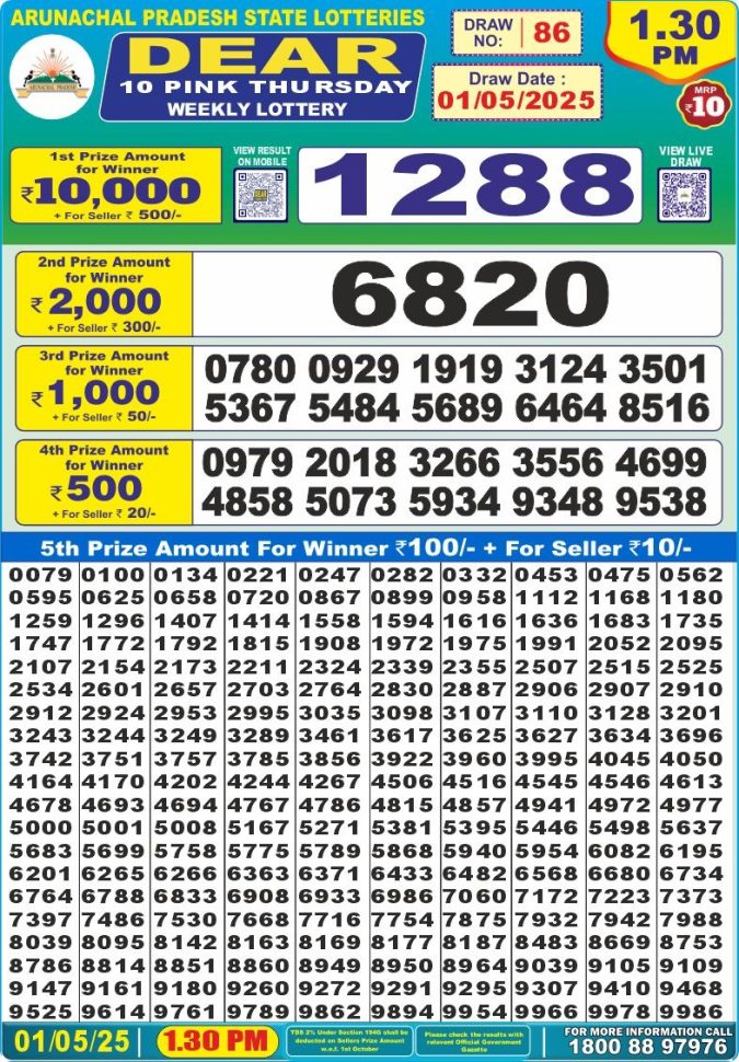 Dear 10 pink lottery 1.30PM Result 1.5.25
