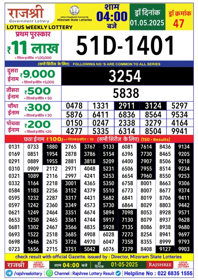 Rajshree Lotus Thursday Weekly Lottery 4PM Result 1.5.25