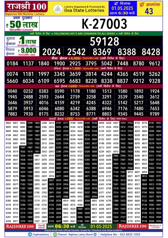 Rajshree 50 Lottery 7:30PM Result 1.5.25