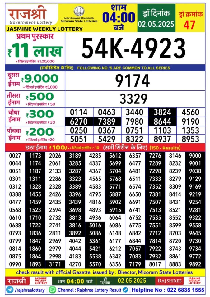 Rajshree jasmine Friday Weekly Lottery 4PM Result 2.5.25