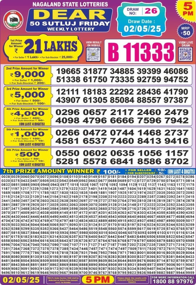 Dear 50 satluj Friday Lottery 5pm Result 2.5.25