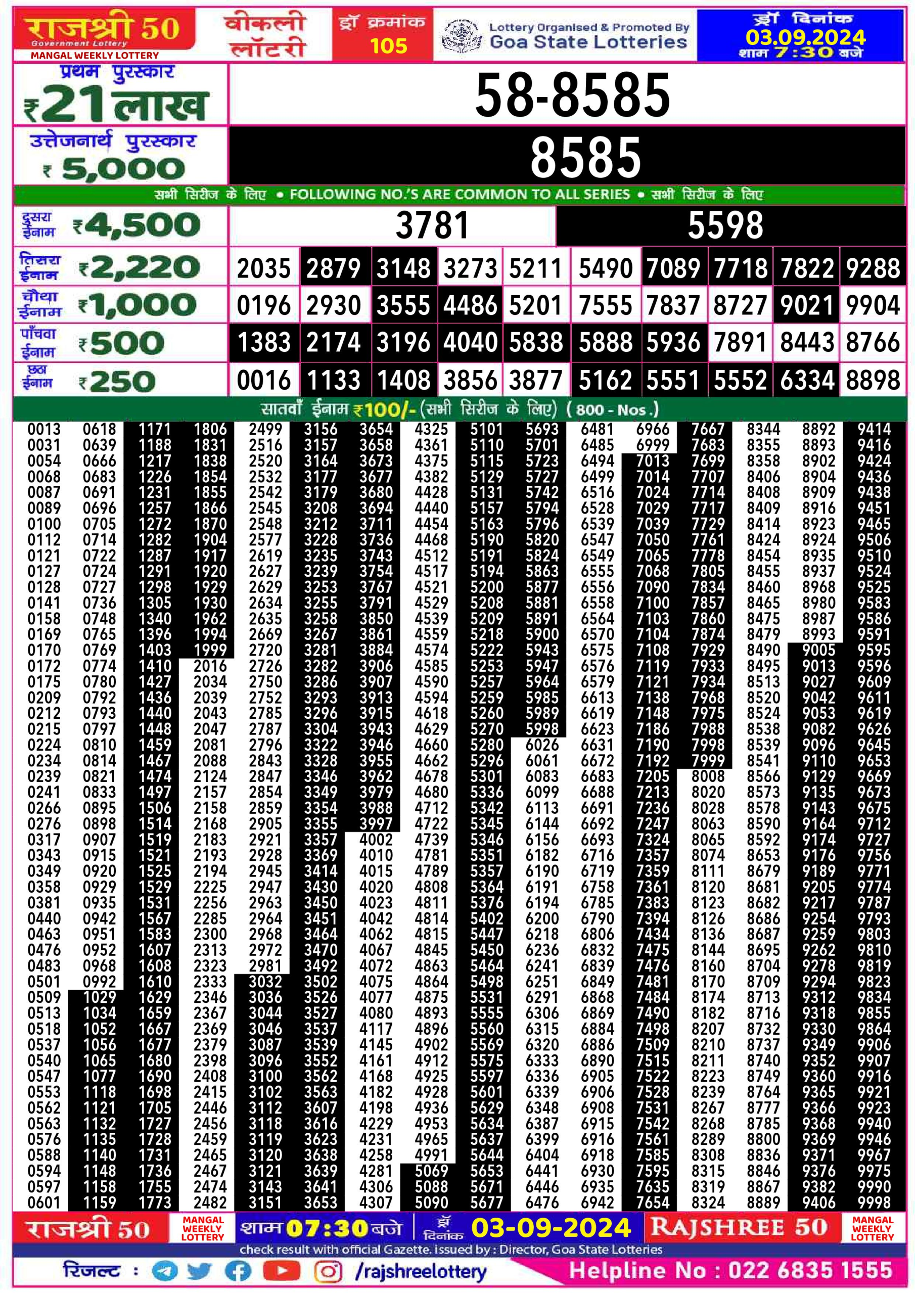 Rajshree 50 Lottery 7:30PM Result 3.5.2025