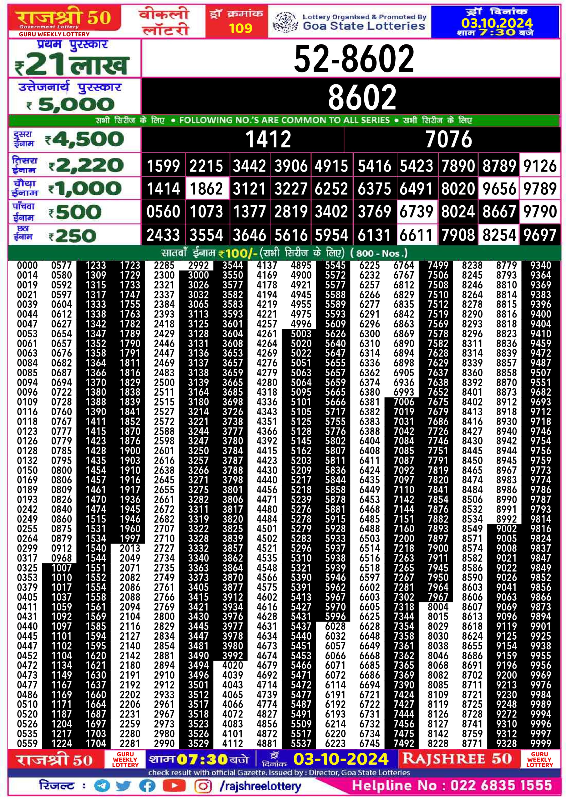 Rajshree 50 Lottery 7:30PM Result 1.5.25