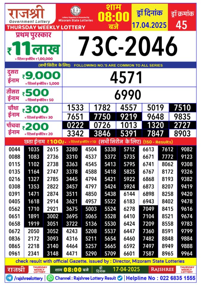 Rajshree Thursday Weekly Lottery 8PM Result 17.4.25