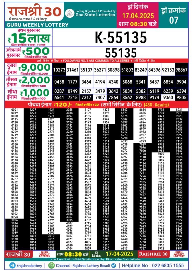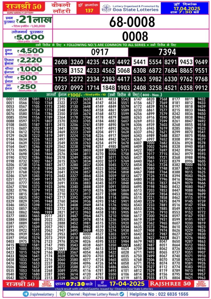 Rajshree 50 Lottery 7:30PM Result 17.4.25