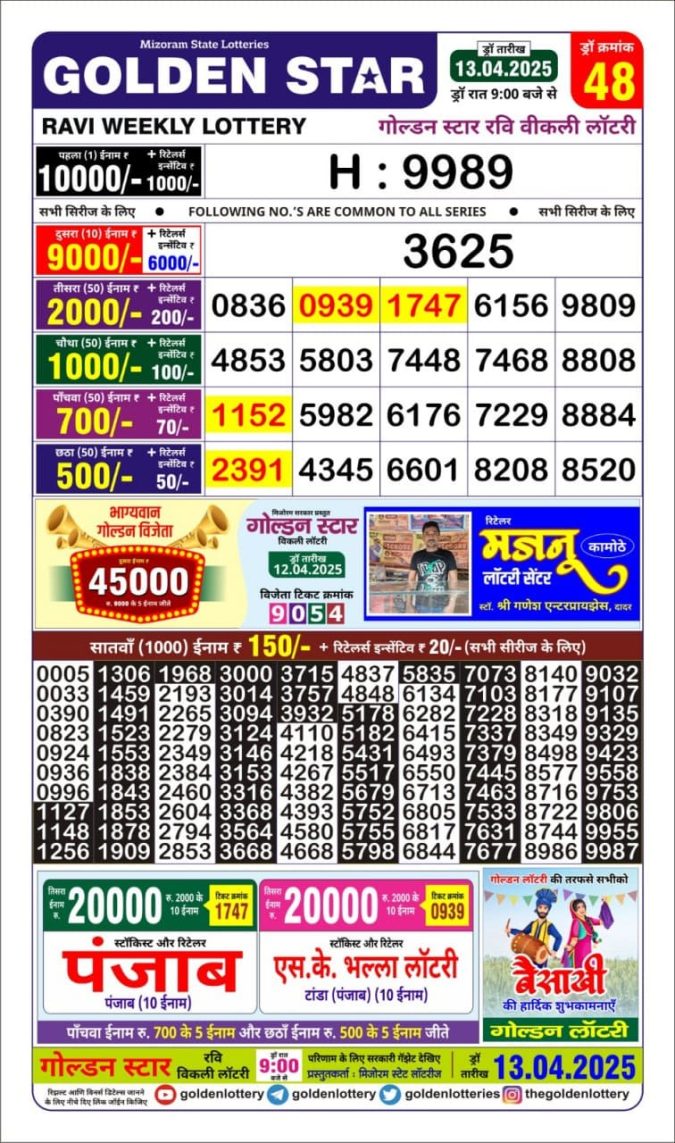 Golden Star weekly Lottery result 9pm 13.4.2025