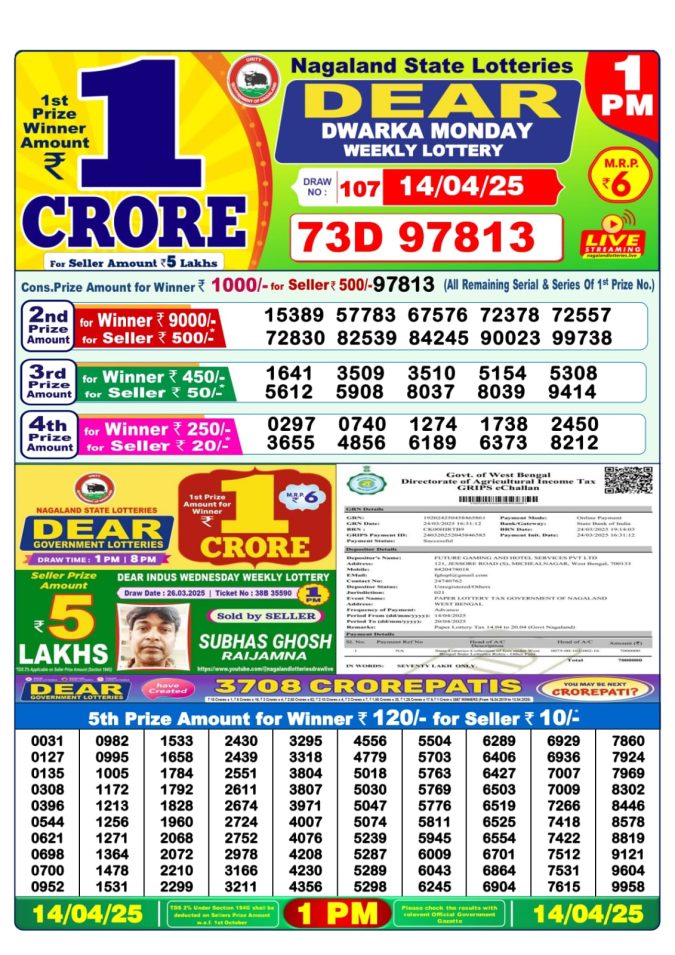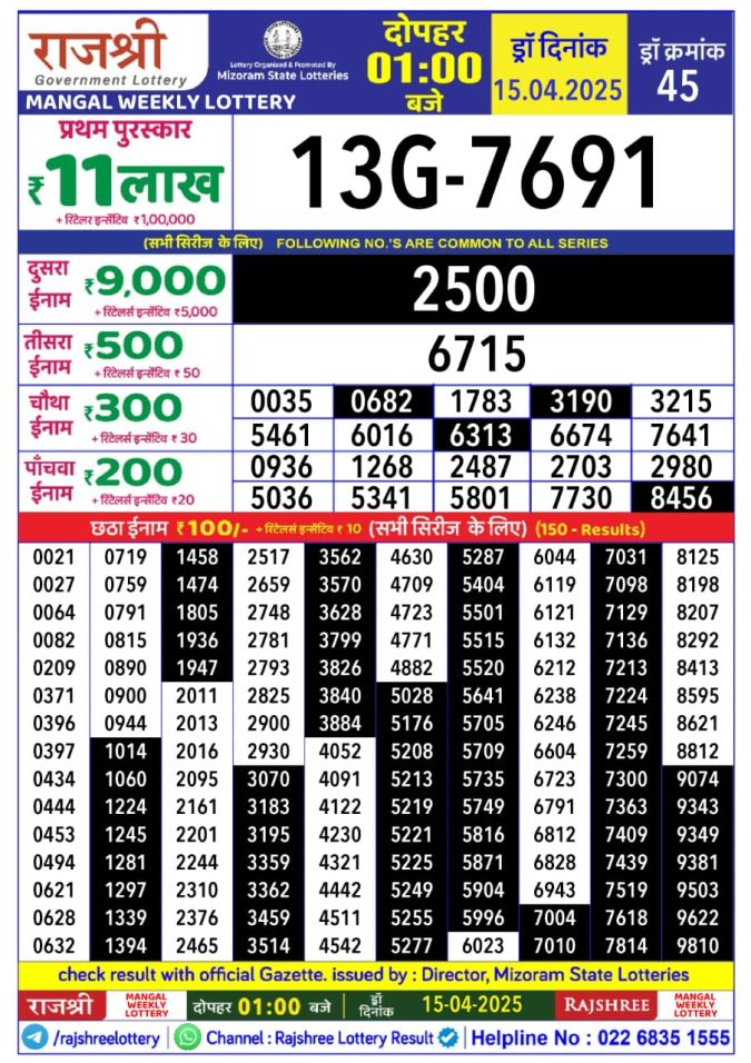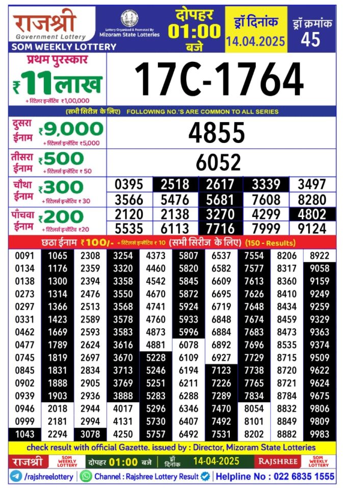 Rajshree som Weekly Lottery 1PM Result 14.4.25