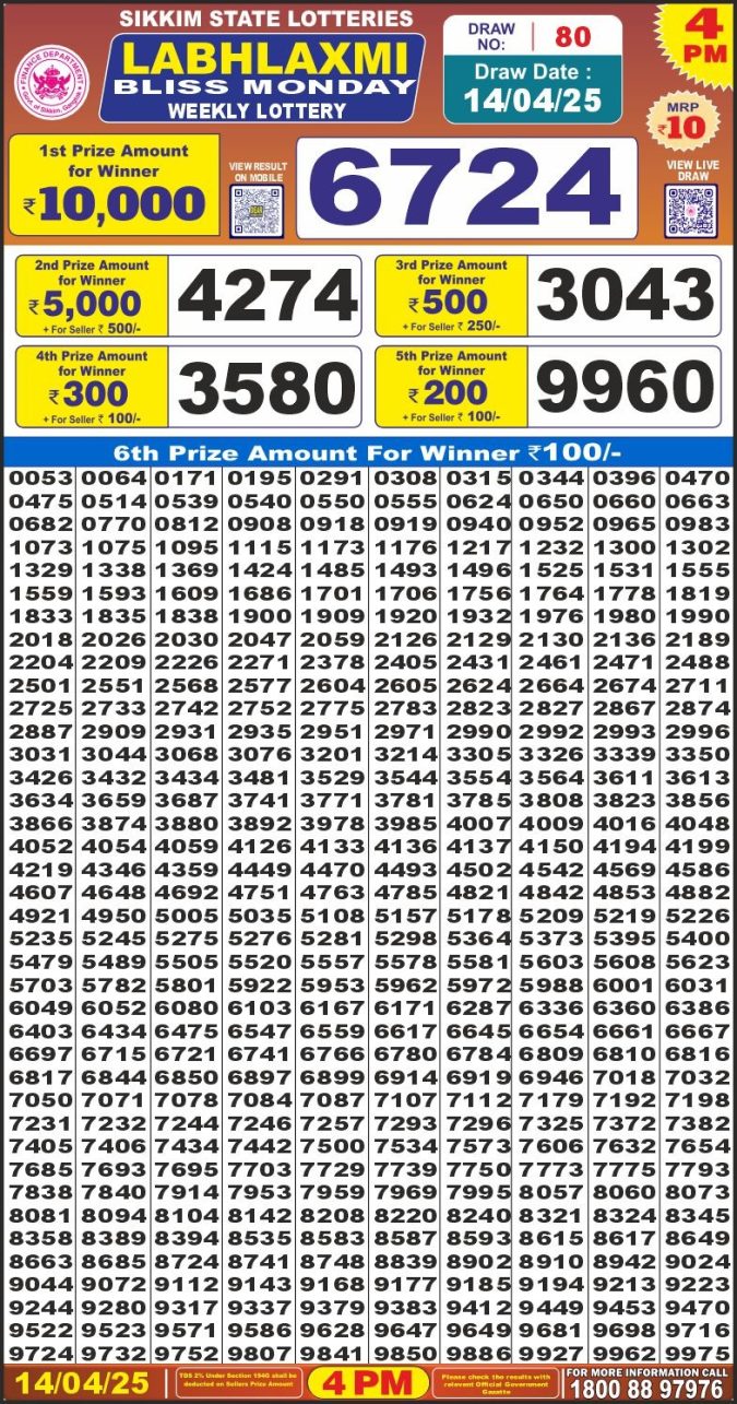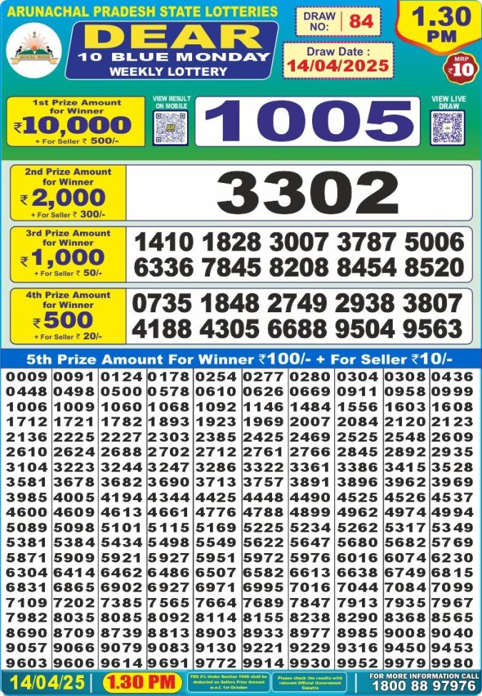 Dear 10 blue lottery 1.30PM Result 14.4.25