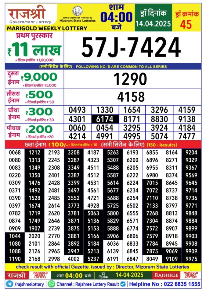 Rajshree marigold monday Weekly Lottery 4PM Result 14.4.25