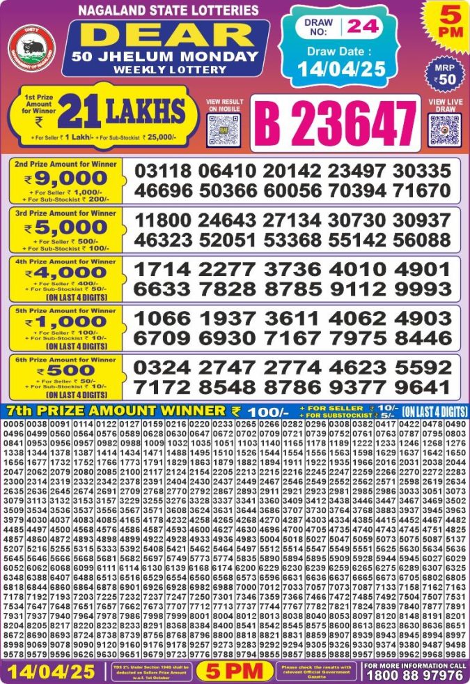 Dear 50 jhelum monday Lottery 5pm Result  14.4.25