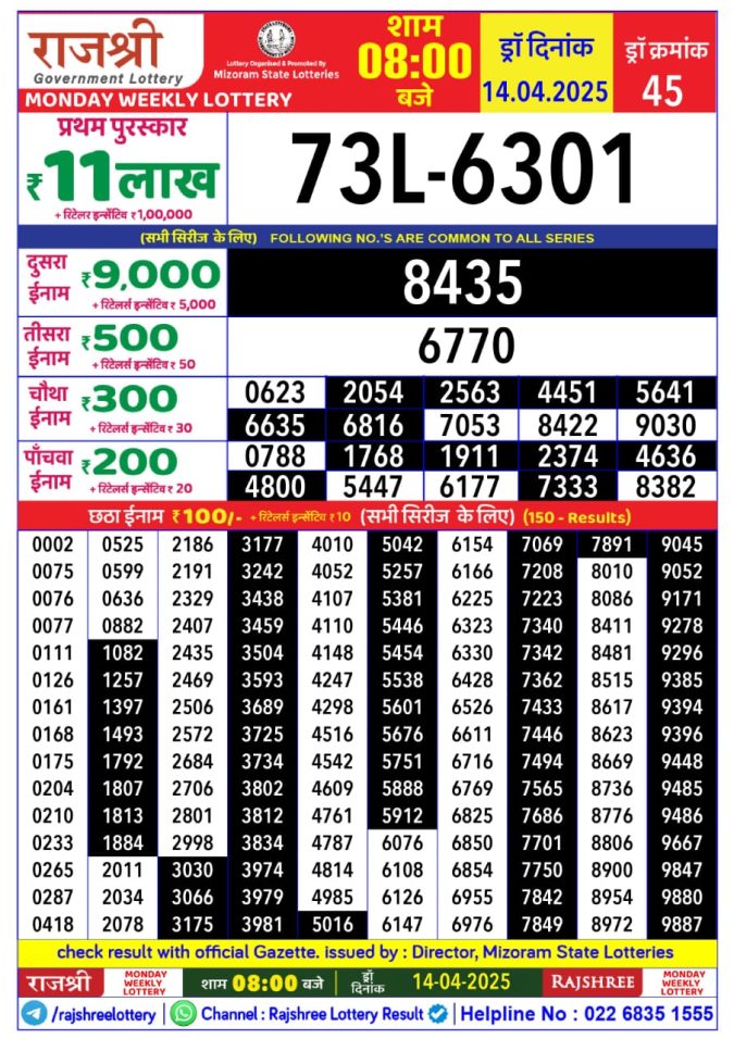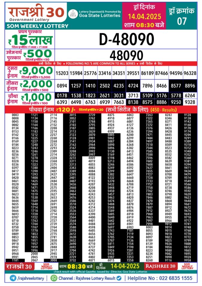 Rajshree Weekly Lottery 8PM Result 14.4.25