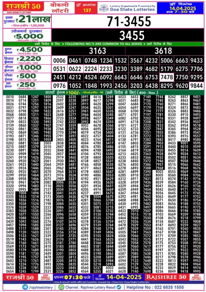 Rajshree 50 Lottery 7:30PM Result 14.4.25