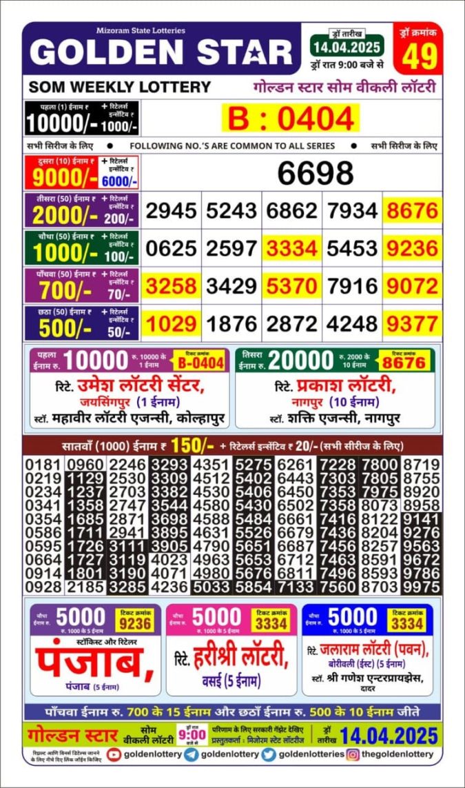 Golden Star weekly Lottery result 9pm 14.4.25