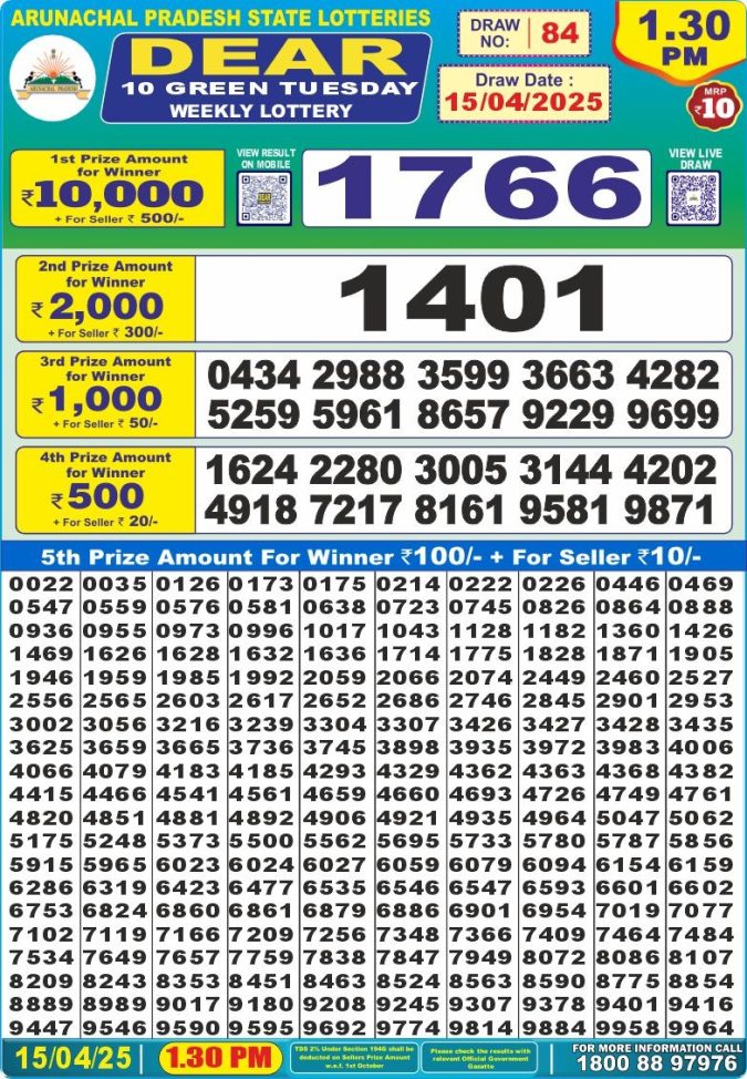Dear 10 green lottery 1.30PM Result 15.4.25