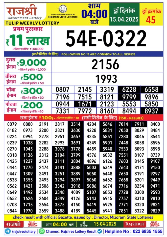 Rajshree tulip Tuesday Weekly Lottery 4PM Result 15.4.25