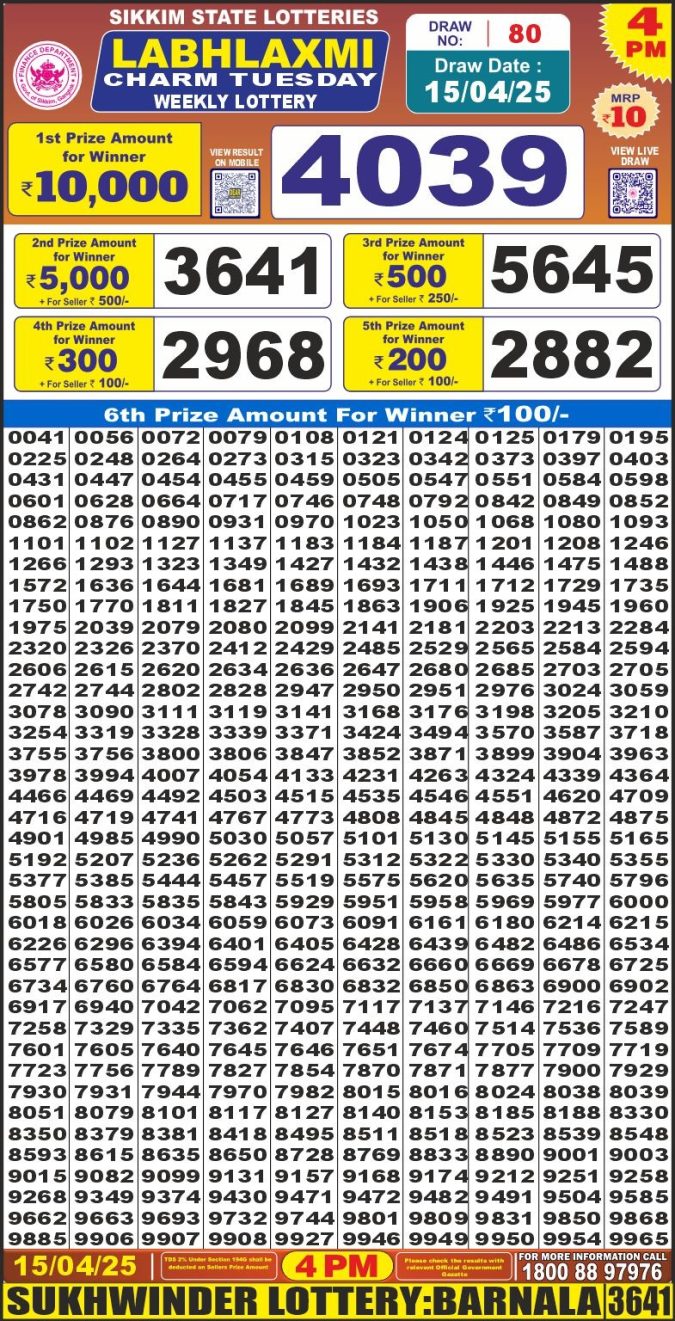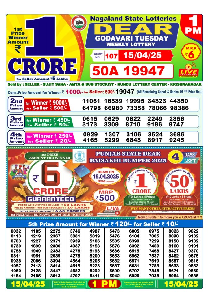 Punjab state dear 10 6pm lottery result 15.4.25
