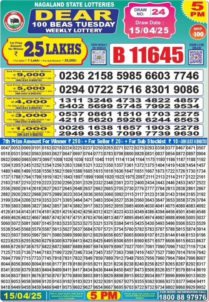 Dear 100 beas tuesday Lottery 5pm Result  15.4.25