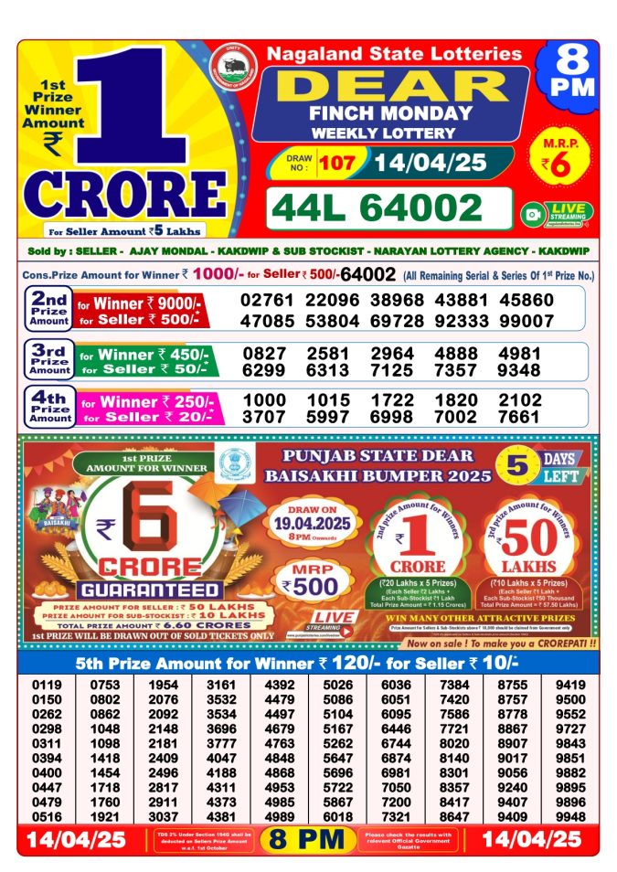 Punjab state dear 10 6pm lottery result 14.4.25