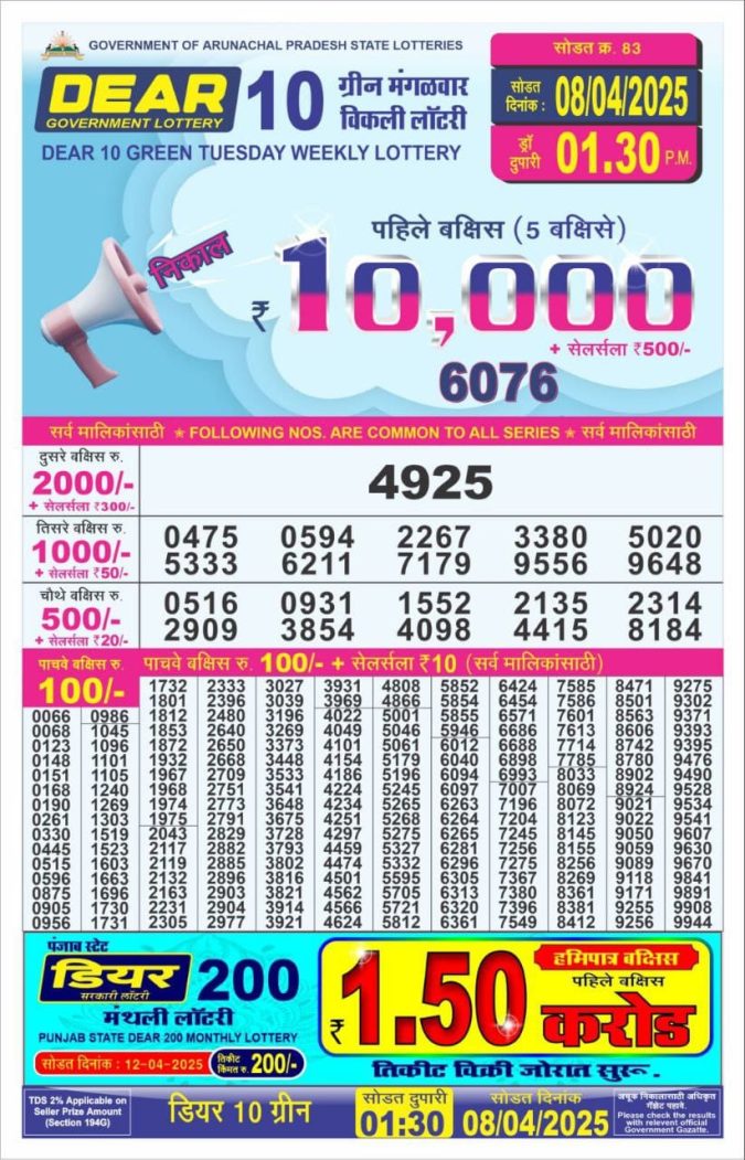 Dear 10 green lottery 1.30PM Result 8.4.25
