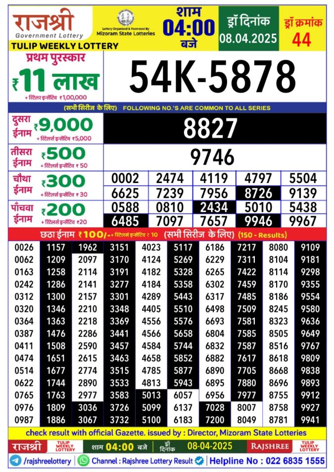 Rajshree tulip Tuesday Weekly Lottery 4PM Result 8.4.25