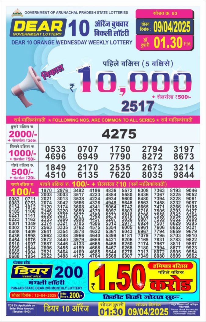 Dear 10 Orange Lottery 1.30PM Result 9.4.25