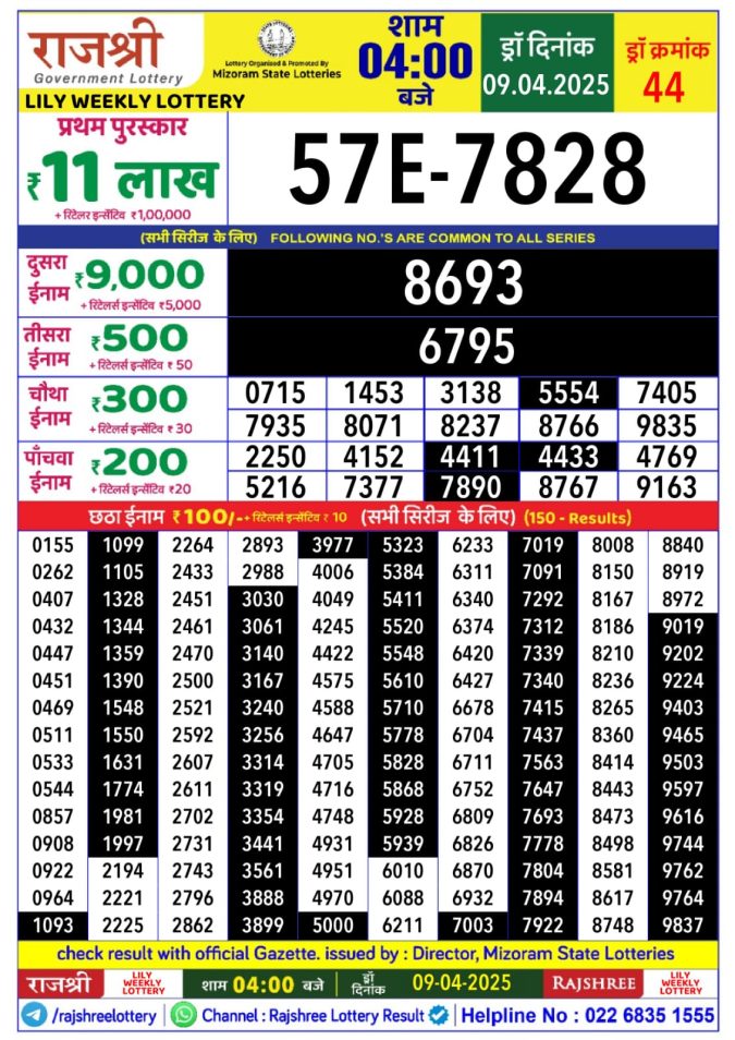 Rajshree Lily Wednesday Weekly Lottery 4PM Result 9.4.25
