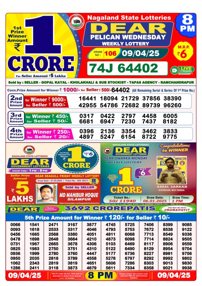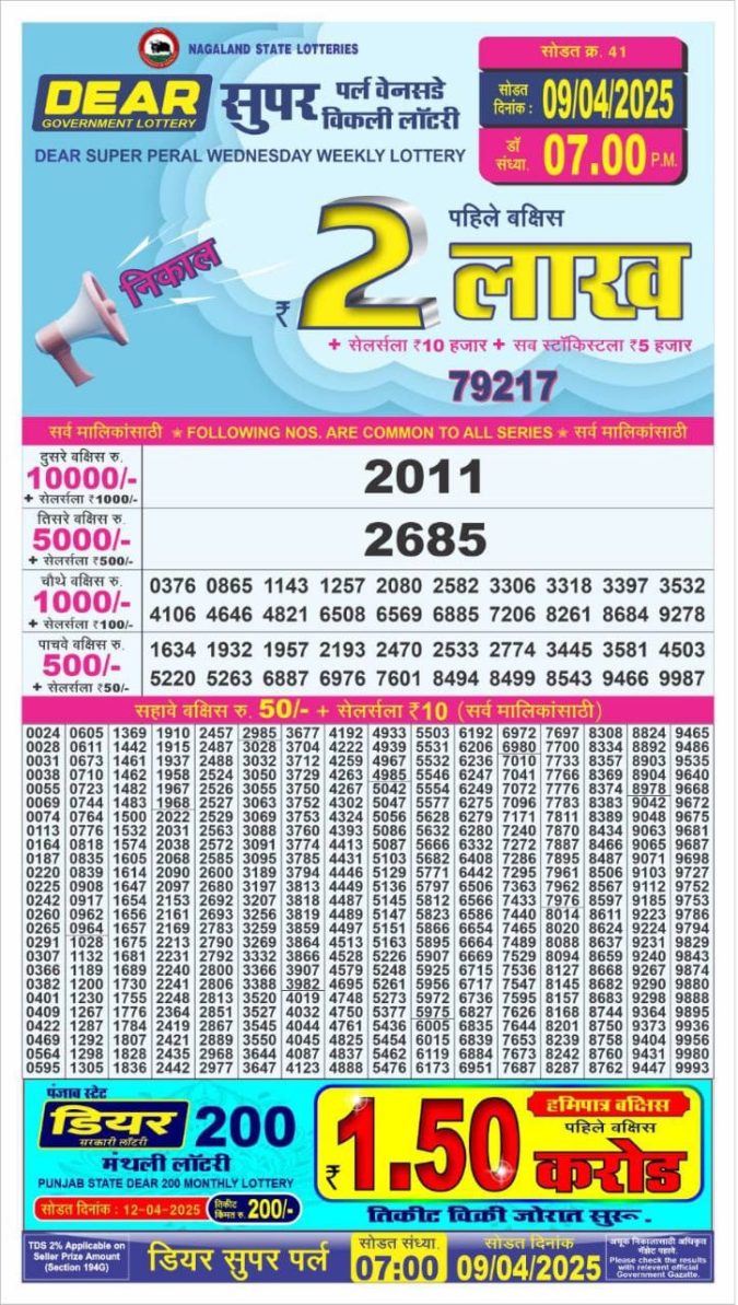 Dear Super Peral Lottery 7pm result 9.4.25