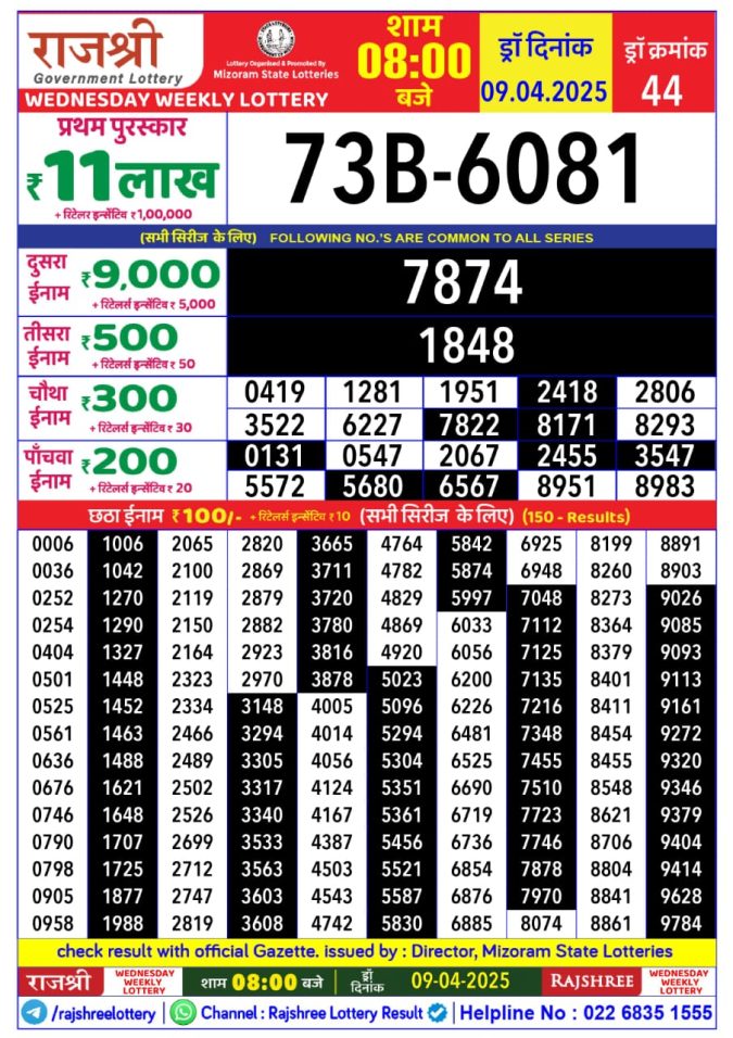 Rajshree Budh Weekly Lottery 1PM Result 9.4.25