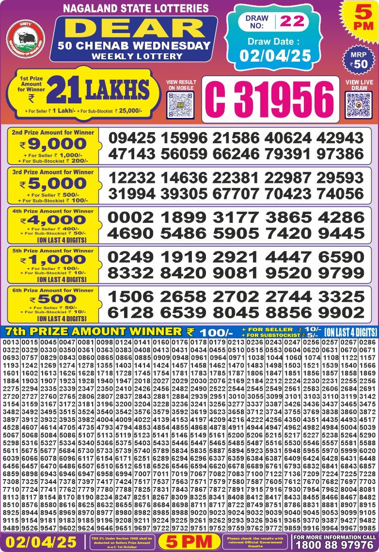 Dear 50 Chenab 5pm Wednesday Lottery Result 2.4.25
