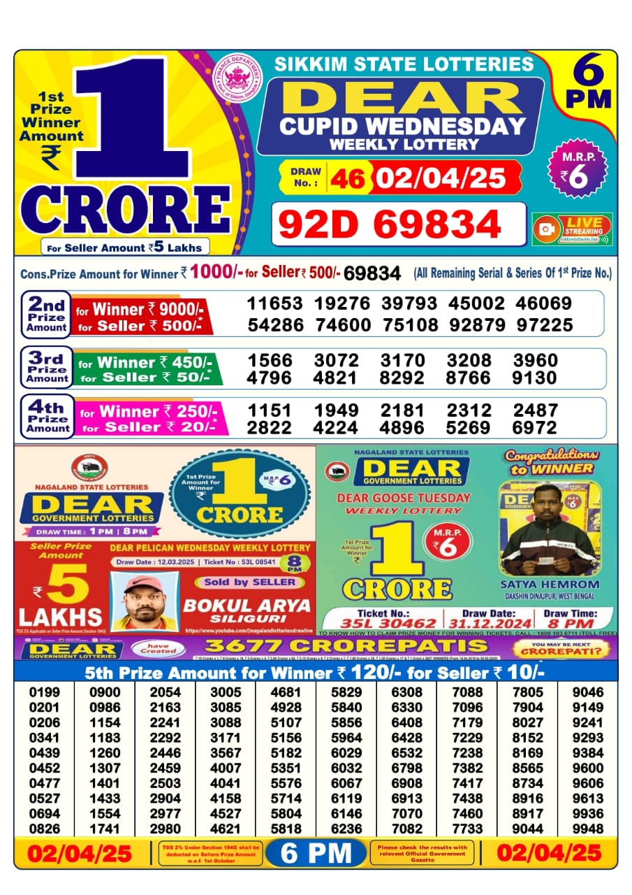 Dear cupid wednesday weekly Lottery 6PM Result 2.4.25