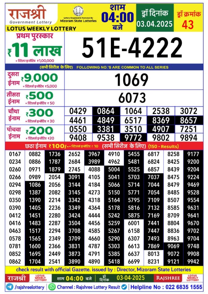Rajshree Lotus Thursday Weekly Lottery 4PM Result 3.4.25