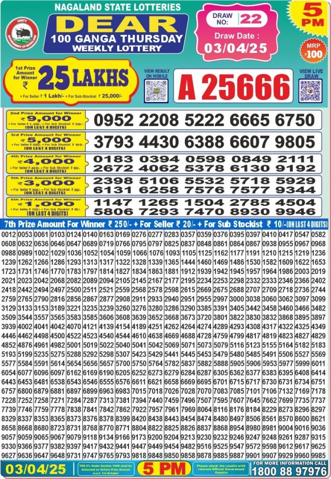 Dear 100 Ganga Thursday Lottery 5pm Result  3.4.25