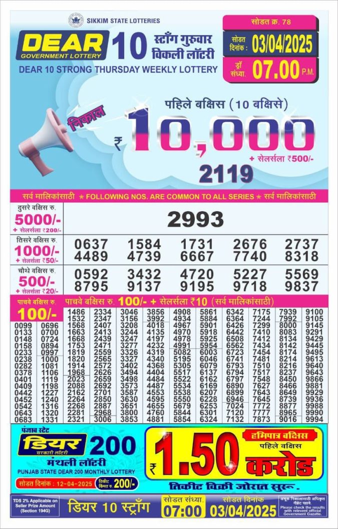 Dear 10 pink lottery 1.30PM Result 3.4.25