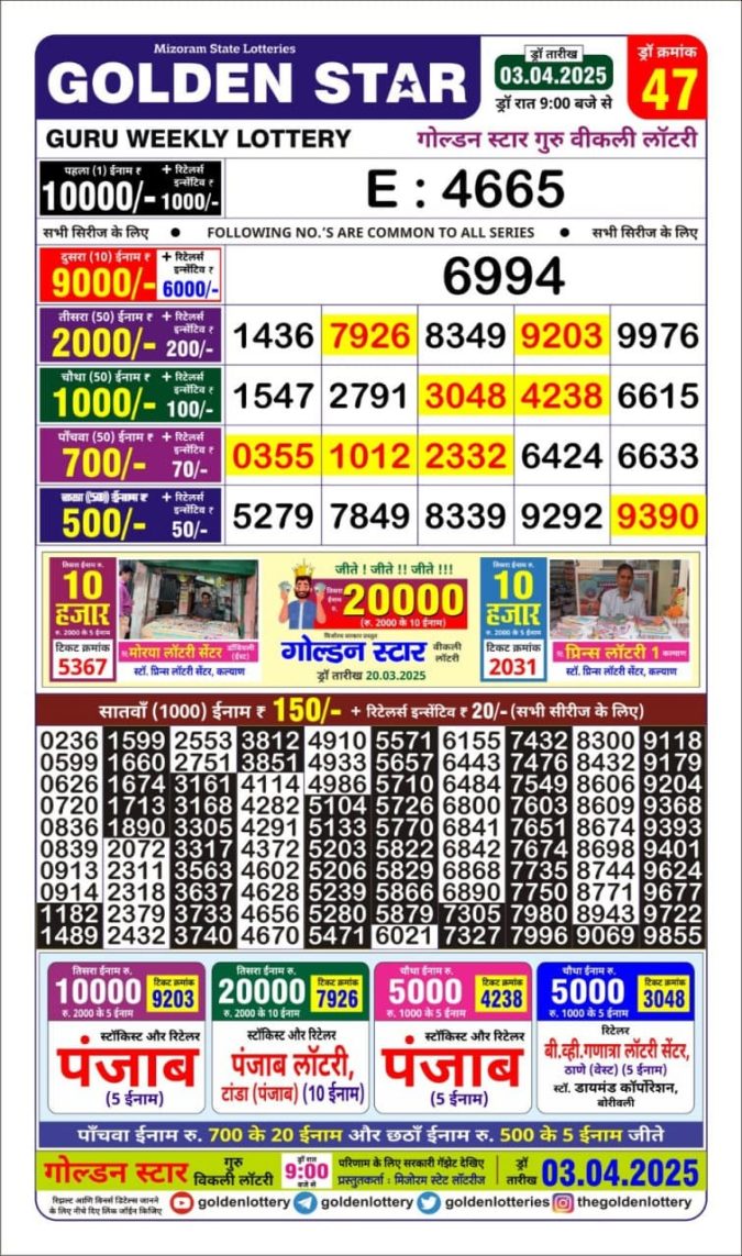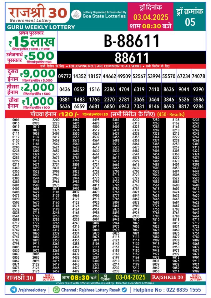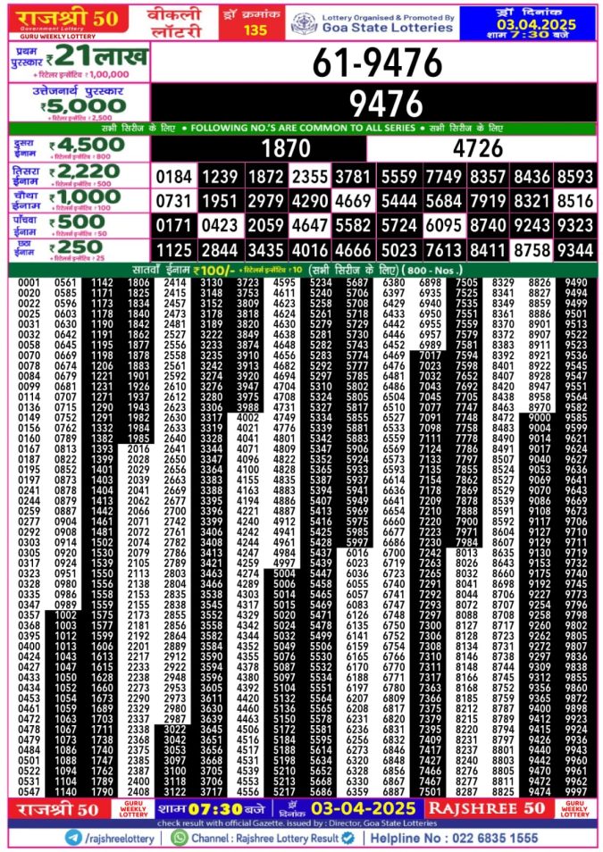 Rajshree Guru Thursday Weekly Lottery 1PM Result 3.4.25