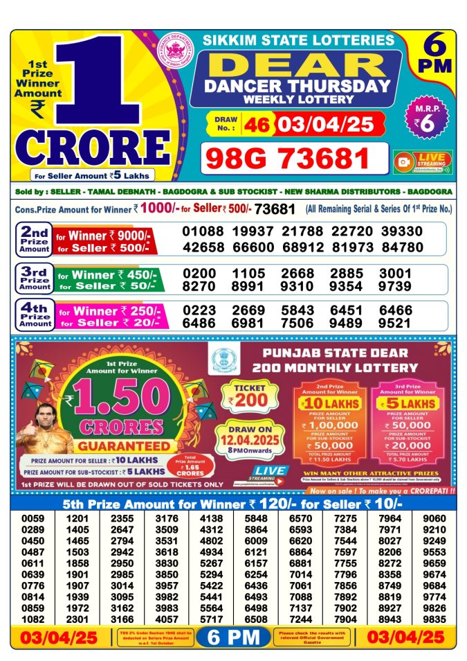 Dear Mahanadi Thursday Weekly 1pm result 3.4.25